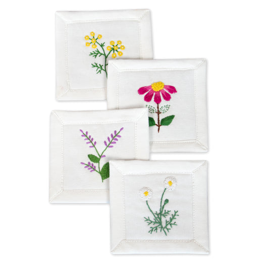 Enjoy these hand embroidered coasters inspired by herbal flowers! Your purchase of this set of 4 ethically crafted coasters, supports the community where we source senna for our Smooth Move teas.