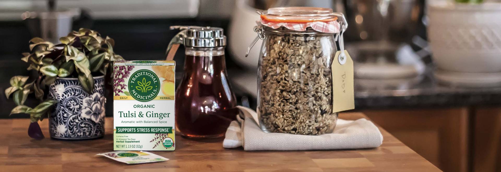 Our Tulsi & Ginger tea supports a healthy response to stress.* Grown in the sunny fields of India, which we blend with ginger for its digestive benefits.*